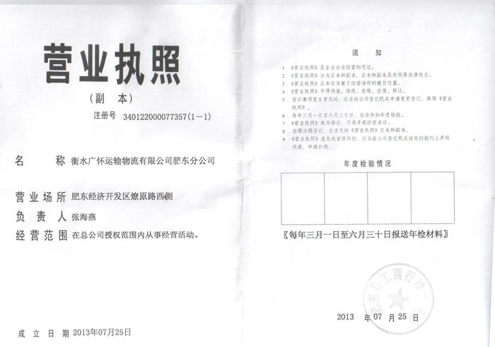 衡水广怀运输物流有限公司肥东分公司营业执照(副本)