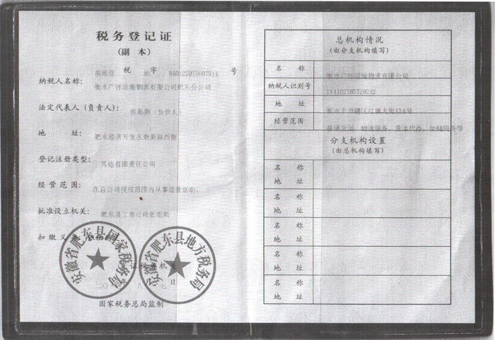 衡水广怀运输物流有限公司肥东分公司税务登记证