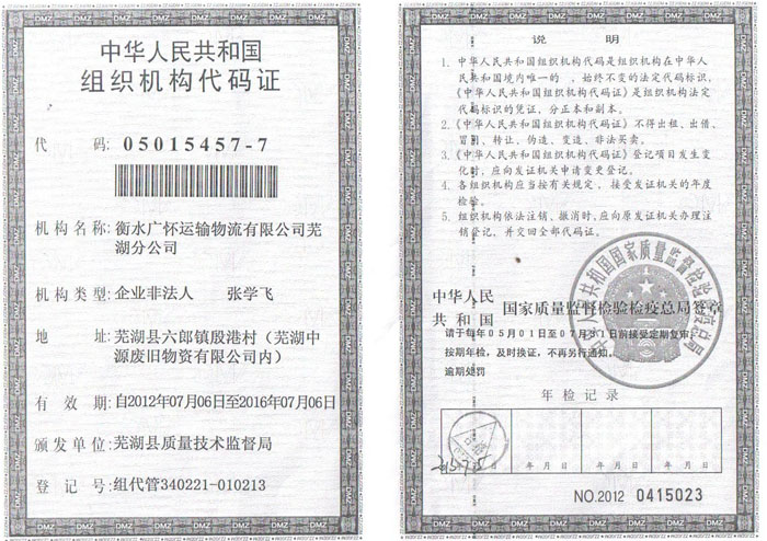 衡水广怀运输物流有限公司芜湖分公司组织机构代码证